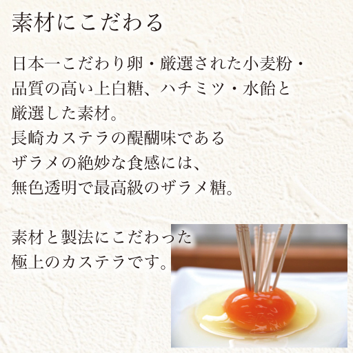 原材料 日本一こだわり卵、砂糖、小麦粉、水飴、蜂蜜、植物ミネラル